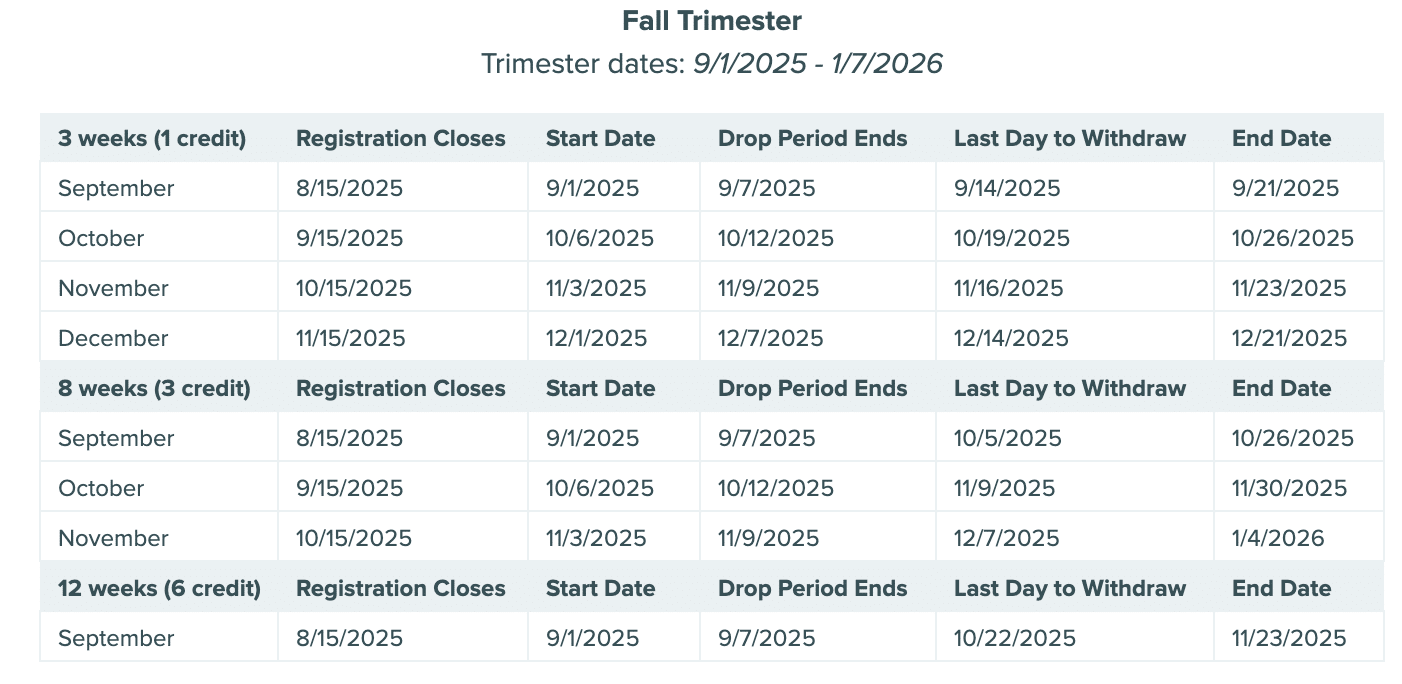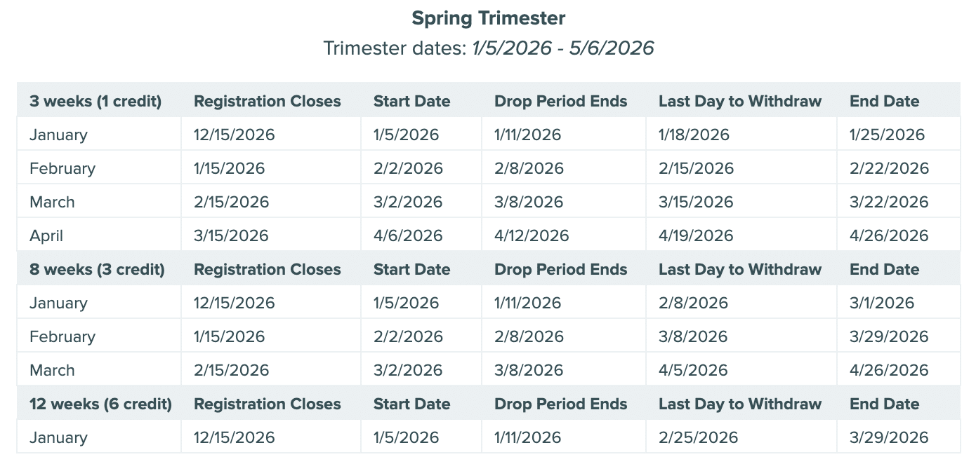 All withdrawal requests must be submitted by midnight Central Time (UTC -5) on the withdrawal deadline date published in the academic calendar. Course withdrawals result in a grade of “W” on the official transcript. Refunds of tuition will be calculated according to the university’s Refund Policy.